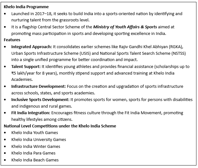 • It is organised under the 'Khelo India Scheme', a flagship initiative of the Ministry of Youth Affairs and Sports, aiming to promote a sports culture and nurture excellence in the field of sports.