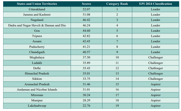 • Based on the overall assessment under EPI 2024, the following States and UTs have emerged as leading performers in their respective categories: