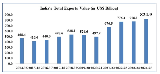 • India’s total exports have touched an all-time high of US$824.9 billion in the financial year 2024–25, as per the latest data released by the Reserve Bank of India.