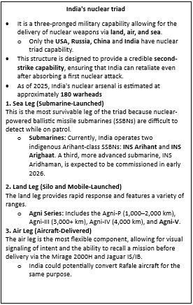 • The K-4 forms the stealthiest leg of India’s nuclear triad, which includes land-based missiles, air-delivered nuclear weapons, and sea-based systems, strengthening second strike capability.