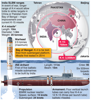 Context: Recently, India successfully tested a nuclear-capable submarine-launched ballistic missile (SLBM) K-4 (Kalam 4) from the nuclear-powered submarine INS Arighat in the Bay of Bengal.