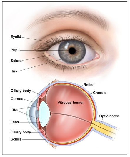 • The cornea is the transparent part of the eye that covers the iris and the pupil and allows light to enter the eye.