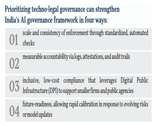 • Nuanced AI governance framework: It highlights India’s pro-innovation approach to AI governance, which integrates baseline legal safeguards, sector-specific regulations, technical controls, and institutional mechanisms.